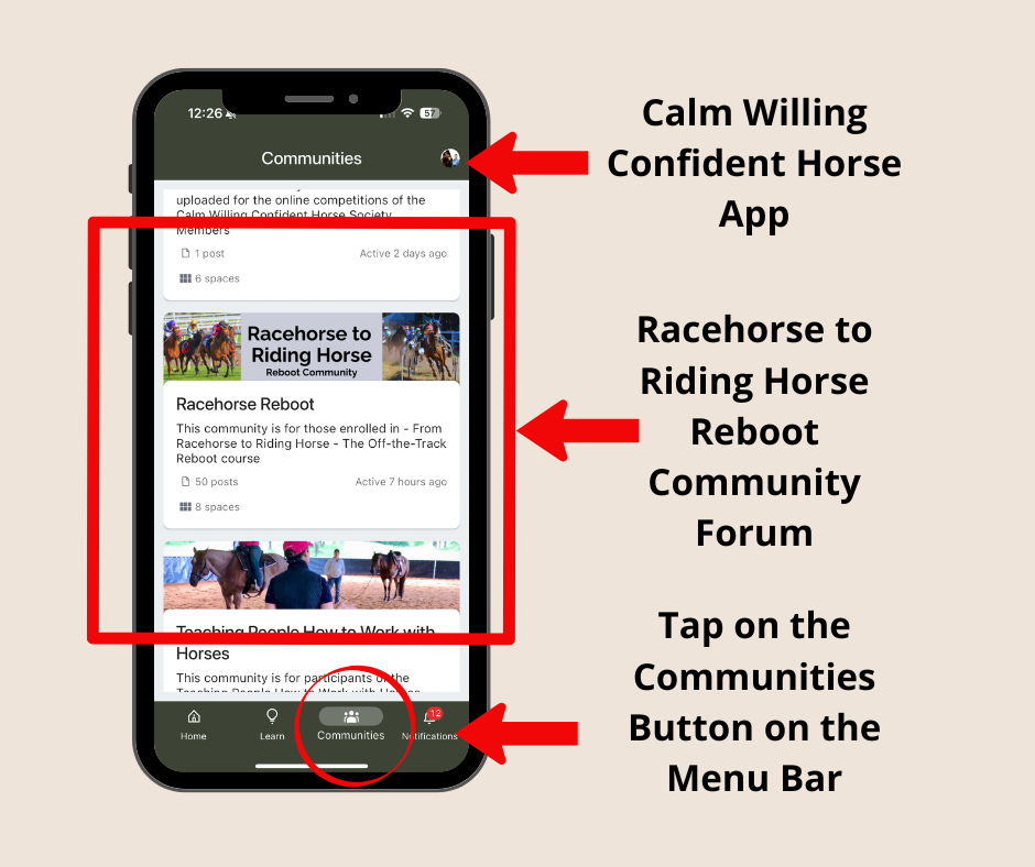 When you join the Racehorse to Riding Horse: Off-the-Track Reboot program, you’ll gain access to our private course forum. This can be accessed via the Calm Willing Confident Horse App or on a web browser. This is where the deeper conversations happen — with personalised guidance from Dr Shelley Appleton, Isabelle Chandler, and experienced community mentors. Whether you’re troubleshooting, celebrating progress, or just need a second opinion, this is your trusted support hub.